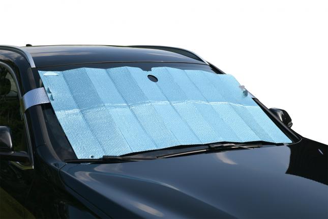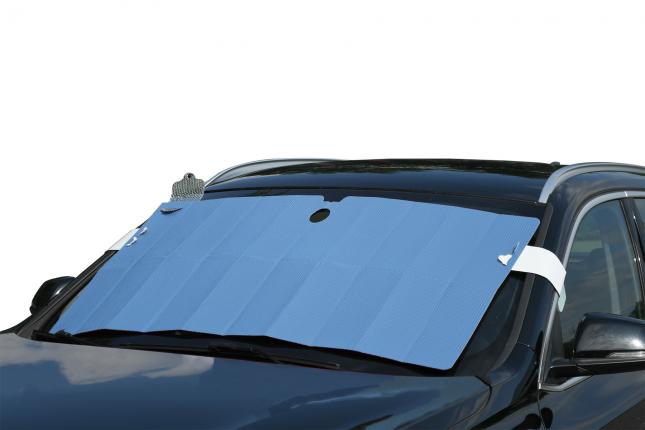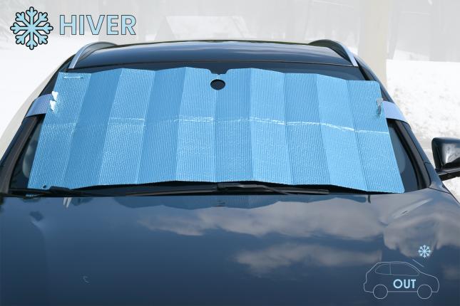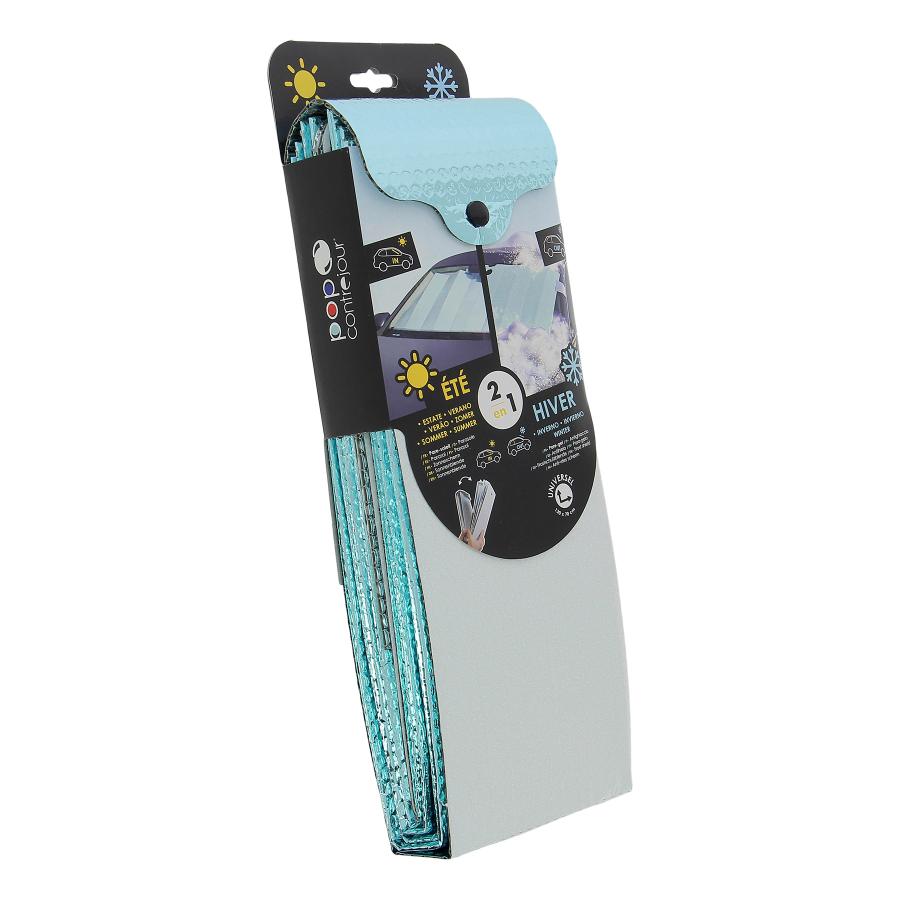 Contrejour POP Colore azzurro cielo 2-in-1: Parasol / Protezione antigelo Uso estivo: posizionare il parasole contro il parabrezza all'interno del veicolo, con il lato bianco rivolto verso il sole per un'azione riflettente del calore. Uso invernale: posizionare il parasole sul parabrezza, all'esterno del veicolo. Inserire le 2 linguette nelle fessure su ciascun lato, per mantenere il parasole in posizione, bloccandolo poi nelle portiere anteriori. Dimensioni: 127x68 cm
