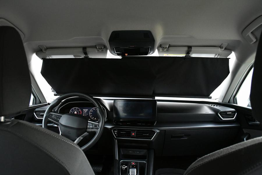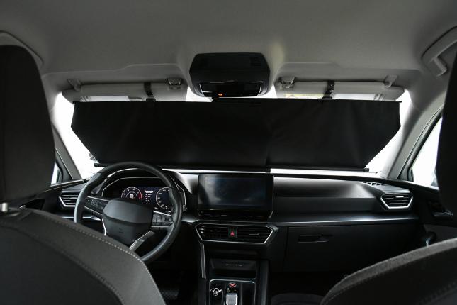 La tendina parasole avvolgibile rinforzata CONTREJOUR è un sistema premium progettato per offrire protezione dal calore e un comfort ottimale nel vostro veicolo. Grazie alla sua struttura regolabile con binario scorrevole e ventose, si adatta alla larghezza del parabrezza e garantisce una protezione solare ottimale. Il suo design robusto consente un utilizzo prolungato, proteggendo le apparecchiature del veicolo (cruscotto, rivestimenti, strumenti) dai raggi UV e dall'usura prematura. Istruzioni per l'uso: Posizionare i due ganci in plastica sulle alette parasole esistenti del veicolo, lato conducente e lato passeggero. Avvitare le due ventose su ciascuna filettatura situata alle estremità del binario. Aprire il binario lungo la base interna del parabrezza per adattarlo alla sua larghezza. Fissare le ventose alle estremità destra e sinistra della parte inferiore interna del parabrezza. Consiglio: inumidire leggermente il retro delle ventose per migliorare l'aderenza. Estendere ciascuno dei due rotoli di tessuto fino a coprire completamente il parabrezza, quindi tenere aperta l'apertura inserendo la maniglia nei ganci installati sulle alette parasole interne del veicolo. Assicurarsi che la tendina parasole sia ben tesa e copra l'intero parabrezza. Al momento di partire, arrotolare entrambi i rotoli di tessuto, staccare le ventose e chiudere la cerniera. Riporre il prodotto nell'apposita custodia. Questo prodotto deve essere utilizzato solo a veicolo fermo.