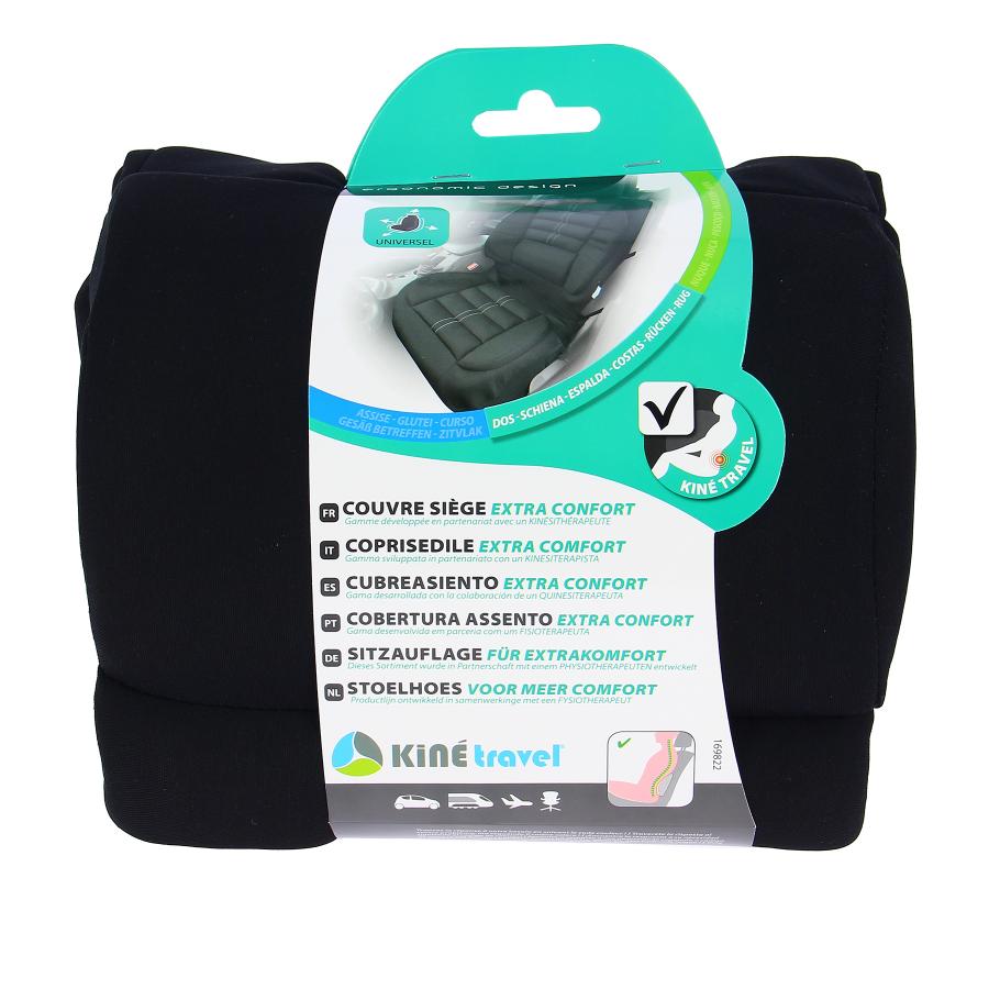 KINE TRAVEL coprisedile comfort La gamma Kiné Travel® propone delle risposte alle situazioni di disagio che si riscontrano in genere in viaggio e che colpiscono la schiena, la zona lombare e la nuca. I prodotti Kiné Travel sono stati sviluppati e testati in collaborazione con un fisioterapista specializzato nella schiena, al fine di offrire una gamma di prodotti perfettamente adattati e un comfort ottimale. La posizione seduta esercita una pressione maggiore sulla schiena rispetto a qualsiasi altra posizione, inclusa la posizione eretta. Per limitare questa pressione, la schiena deve mantenere l'incavo naturale della colonna situata a livello delle vertebre lombari. Il rivestimento del sedile con supporto lombare integrato permette questo: ripristina quest'incavo, e quindi limita le sollecitazioni sulle vertebre e riposa i muscoli della colonna vertebrale. I cuscinetti in schiuma di questo coprisedile forniscono anche supporto e comfort per tutto il corpo. Questo modello dal design universale si adatta a tutti i tipi di corporatura. Questo coprisedile vi offrirà il massimo comfort in macchina e vi consentirà di supportare meglio la posizione di seduta a lungo, grazie al supporto lombare integrato e ai cuscinetti di schiuma. Facile fissaggio al sedile. Airbag laterali compatibili. Lavabile a mano Dimensioni 116x54cm - Misura universale, adatta a tutti i tipi di veicoli. Schiuma comfort ad alta densità