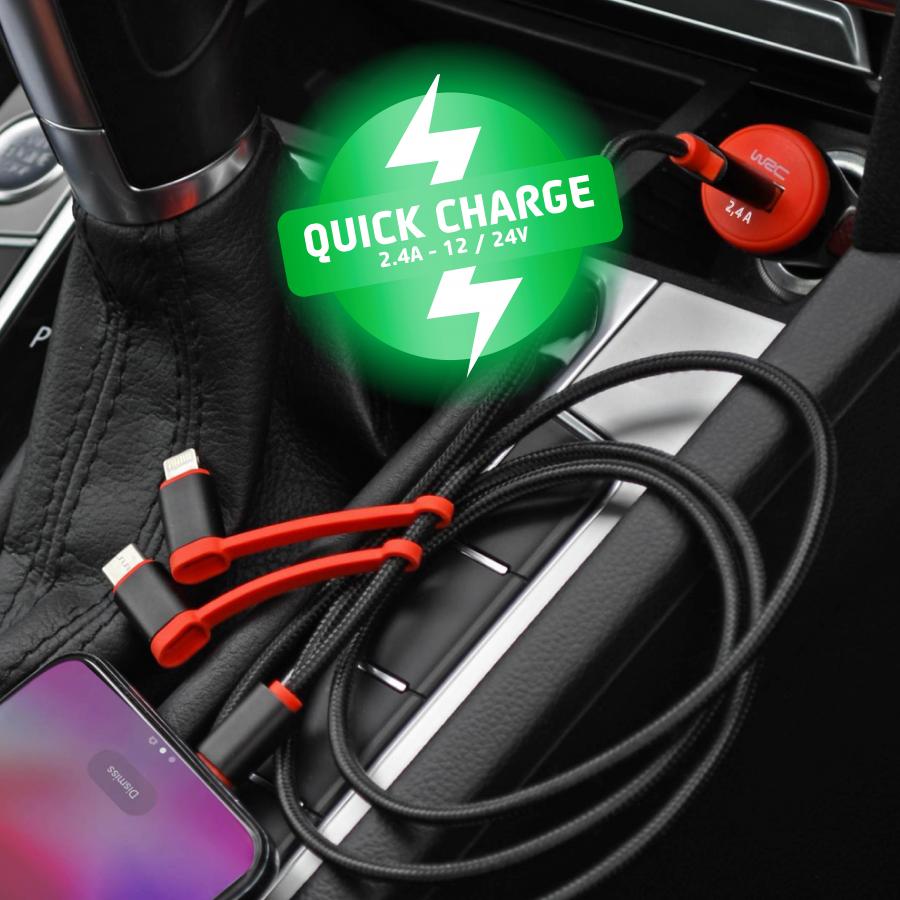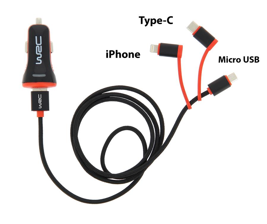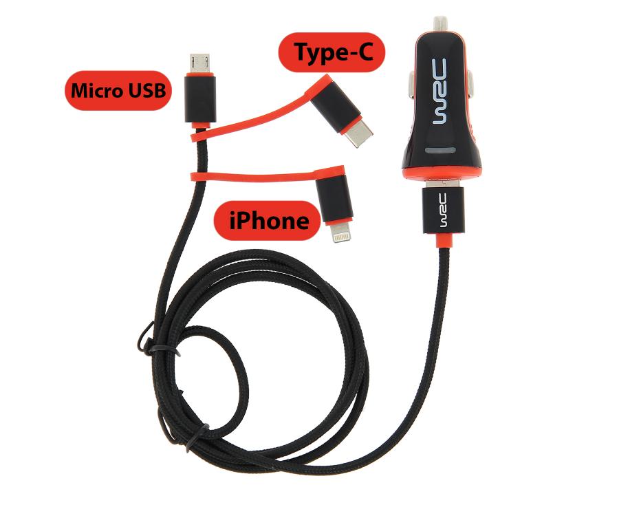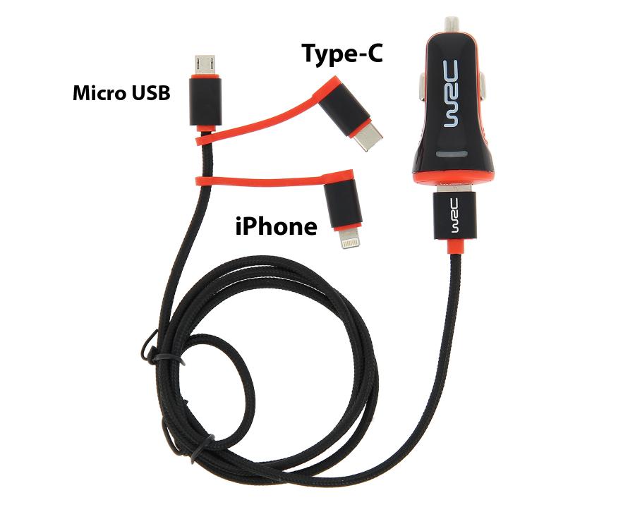 Kit presa accendisigari WRC da 2,4 A con LED di funzionamento + cavo di alta qualità (ricarica e trasferimento dati (trasferimento dati). Il cavo di ricarica da 100 cm rinforzato e rivestito in tessuto ha 3 connettori per il tuo cellulare, tablet, computer o qualsiasi dispositivo con Micro-USB, USB-C o iPhone Lightning.