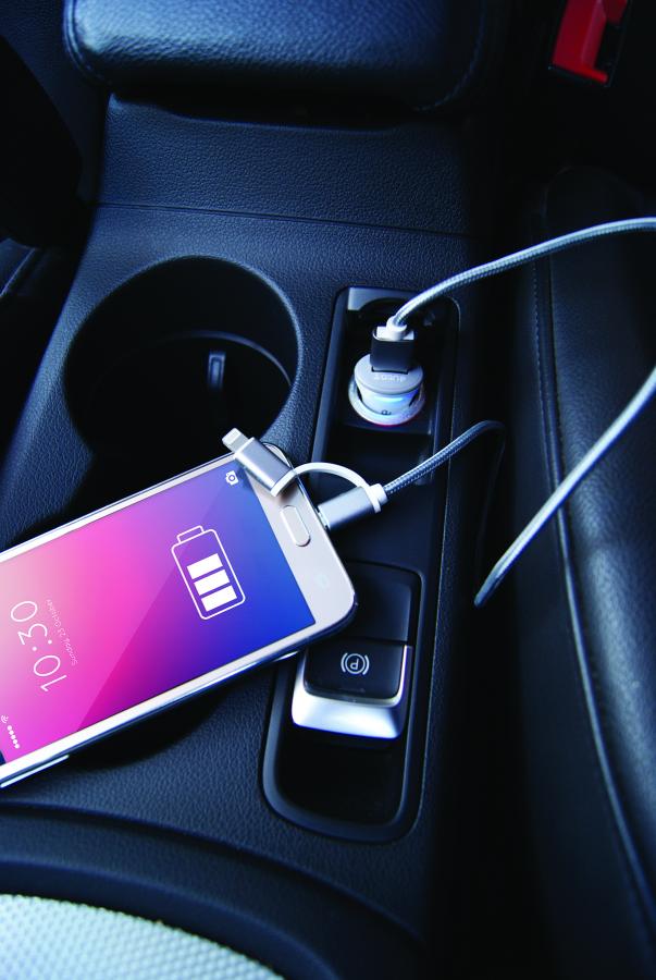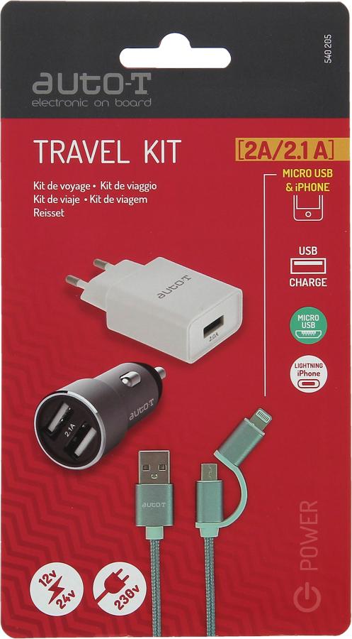 Kit da viaggio completo Auto-T 3 pezzi . 1. Una presa accendisigari 12V / 24V USB 1A, con indicatore LED di funzionamento 2. Una presa da 230 V con 1 porte USB da 1A. 3. Un cavo di fascia alta: dati (trasferimento dati) e ricarica. Cavo da 100 cm, rinforzato, rivestito in tessuto con doppi connettori: micro USB (Android) + connettore Lightning (Apple 5, 6, 7, 8, X)