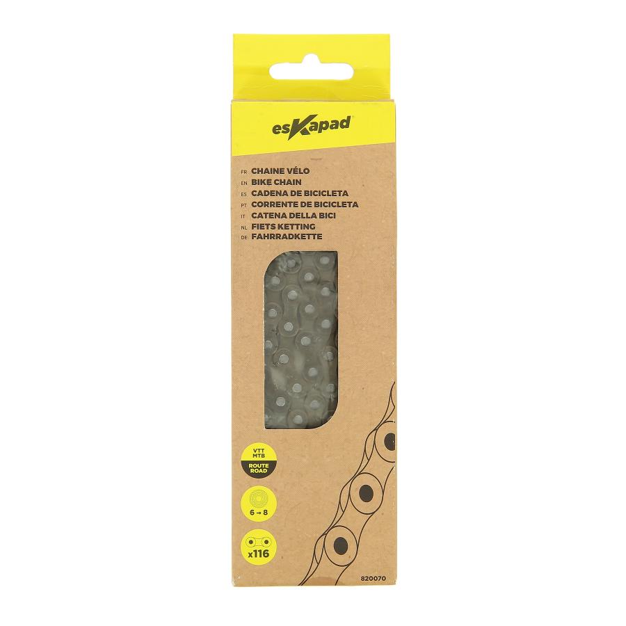 Catena per bicicletta 6/7/8 velocità 116 maglie Compatibile: 6/7/8V Shimano e Sram Numero di velocità: 6/7/8 Per bici da strada e mountain bike. Eskapad, la gamma di accessori, d attrezzature e materiali di consumo bici per soddisfare il più possibile le aspettative dei consumatori Packaging responsabile, con uso ridotto di plastica.